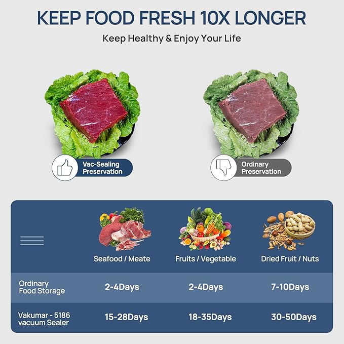 - 【Double Heat Seal & 10X Longer Fresh Time】- This seal a meal vacuum sealer machine is double-heat seal provides added strength and security when sealing liquid-based or moist foods. vacuum saver machine provides a secure, airtight heat seal to keep food fresh up to 10 times longer. Well for prep-ahead meals, leftovers, and produce stored in the fridge to prevent freezer burn and food waste.