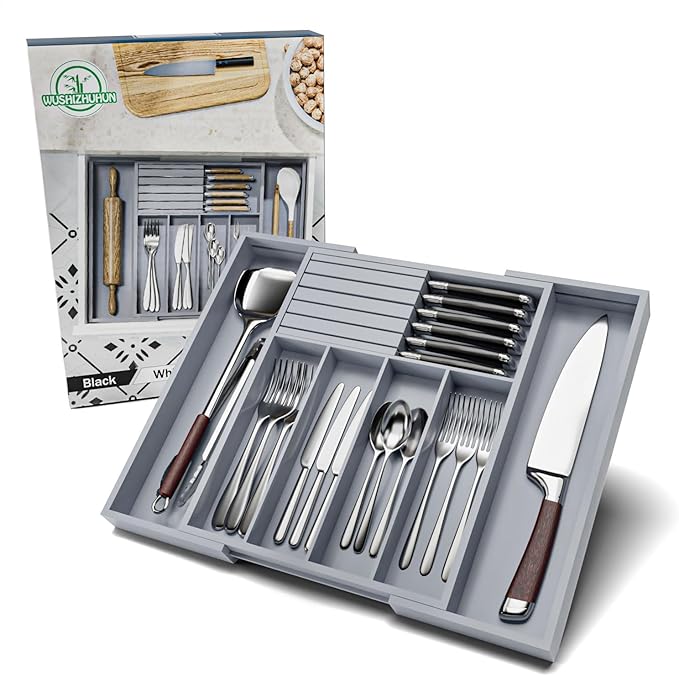 - 【3-in-1 Organizer】: Kitchen Drawer organizer with steak knife holder, no assembly required. It can store kitchen utensils, knives and silverware together, which can effectively complete the kitchen organization work and keep your tableware in order, beautiful and tidy.