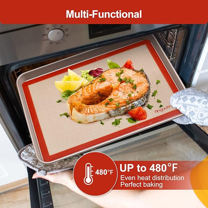 - 【MULTI-PURPOSE USE】--Silicone mats for baking can be use in Oven and Freezer, for baking different foods( Meat, Vegetables,Cookie, Bread, Pizza Macaron...) Pastry Dough and Table mat