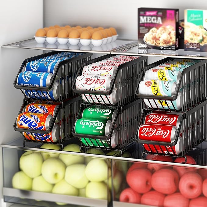 - Stackable Design: This stackable beverage soda can organizer rack was the stackable design. You can overlay 2 baskets together or use each basket alone.The stackable design maximizes storage space which ideal for organizing small or crowded kitchen spaces and keep your fridge organized
