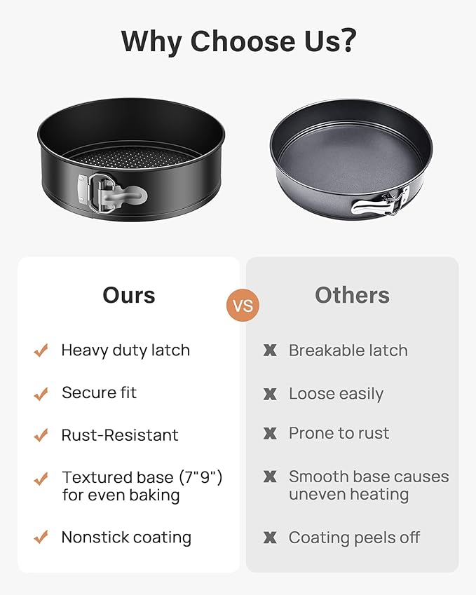 - Durable, Even-Heating Springform Pans: Made from high-quality carbon steel, the spring cake pans heat evenly and resist warping, providing consistent baking results. Oven-safe up to 450°F, these springform pans, including the 9-inch chessecake springform pan, are essential baking tools for both novice and expert bakers alike