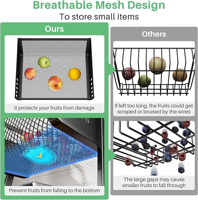 - Air-Flow Mesh Basket: The 3-tier fruit basket has mesh holes that can hold some small fruit like grapes and other nuts, and let the air go across the fruit and basket. Keep the fruit and vegetable fresh