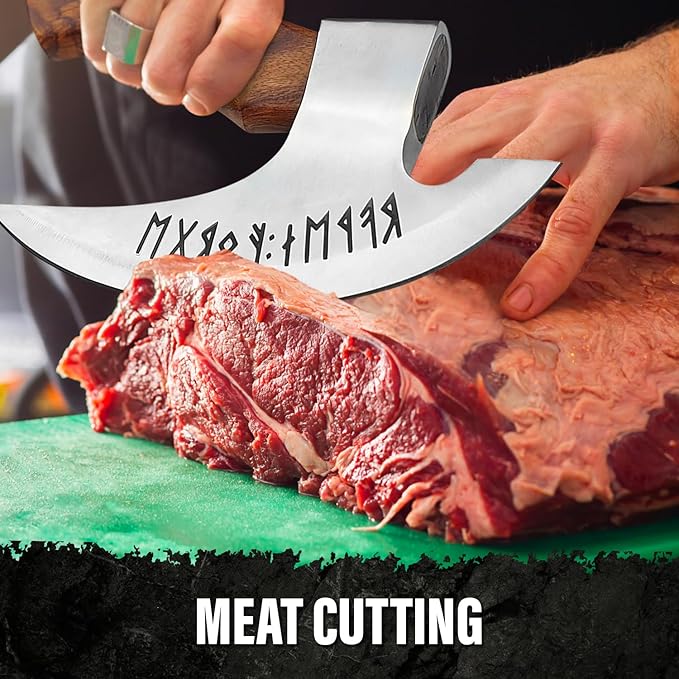 - ✅ ERGONOMIC DESIGN FOR COMFORT - The handle of this small Viking axe is crafted with your comfort in mind. It ensures a secure grip, reducing any strain or discomfort during use. Whether you're chopping herbs, slicing meats, or tackling other kitchen tasks, its exceptional comfort and durability make it the best butcher axe, kitchen axe, meat axe, gardening axe, pizza axe, or even hunting axe.