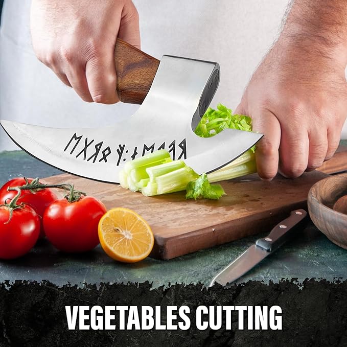 - ✅ EXCEPTIONAL GIFT CHOICE - This cool small Viking Axe is perfect for anyone who loves cooking and Viking stuff. This small Viking axe is super durable and can do lots of jobs, like cutting meat, veggies, or even pizzas and sandwiches. You can use it in the kitchen or out in the garden or for hunting. It's not just for show; it's a real helper!