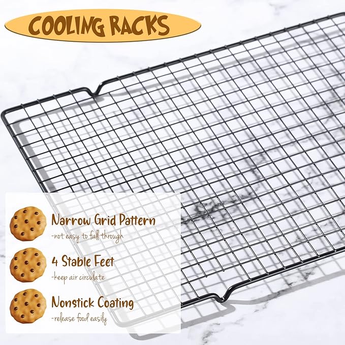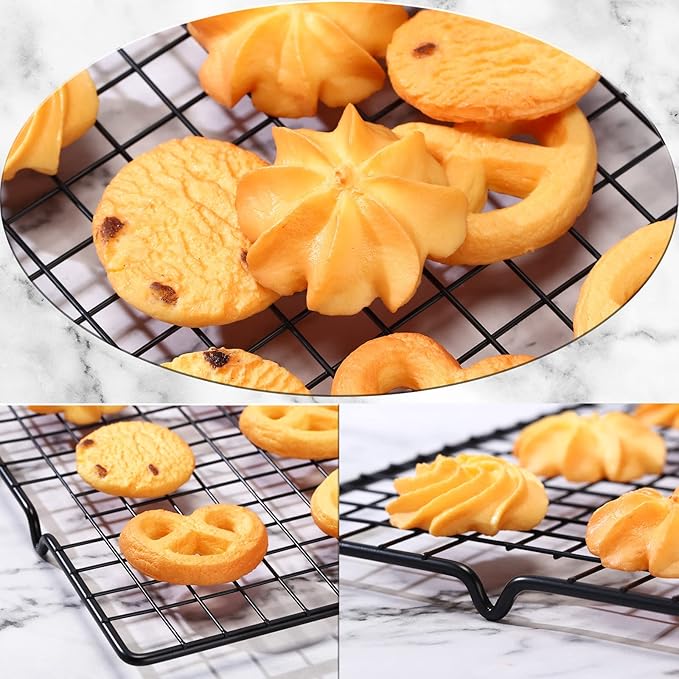 - Better Cooling Effect: the cookie drying racks have dense parallel lines to keep food from slipping through the racks, and the 4 feet design ensures the air circulation, which can not only make food bake evenly but also can save much baking time