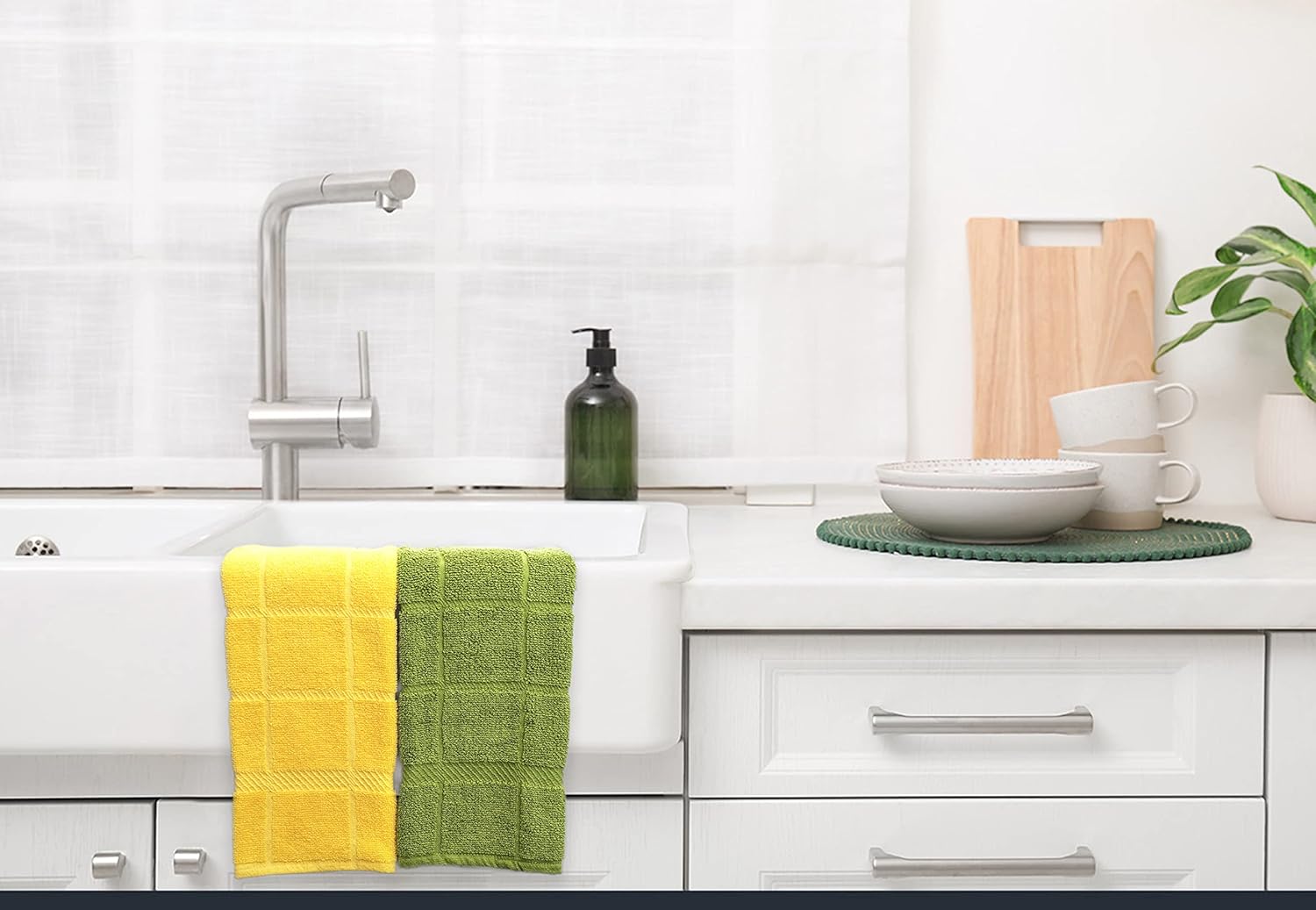 - Mellow buff dishcloths and dishtowels are made of 100% cotton with supreme quality and exquisite workmanship. Designs are simple, perfect size and it will give the feeling of being home by co-ordinating with most kitchen decor.