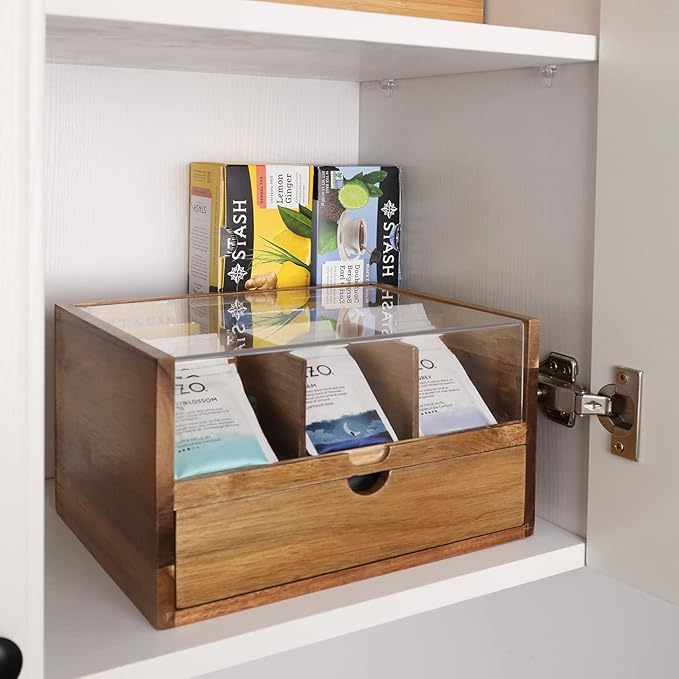 - ACACIA WOOD TEA BAG ORGANIZER: The tea box is made of natural gorgeous acacia wood which is known for its unique and natural contrasting patterns. this tea box looks great on the counter of your kitchen, pantry, or living room.