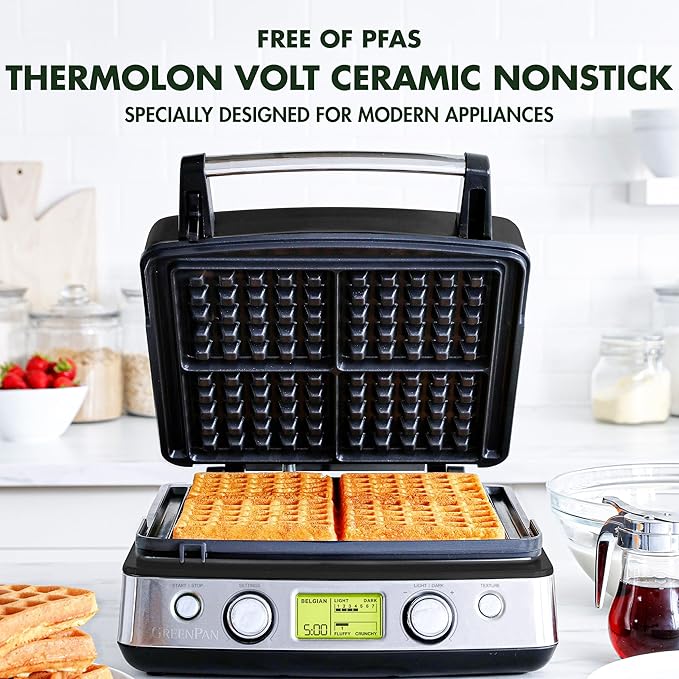 GreenPan Elite 4-Square Belgian & Classic Waffle Maker, Healthy Ceramic Nonstick Aluminum Dishwasher Safe Plates, Adjustable Shade/Crunch Control, Wont Overflow,Easy Cleanup Breakfast,PFAS-Free,Black