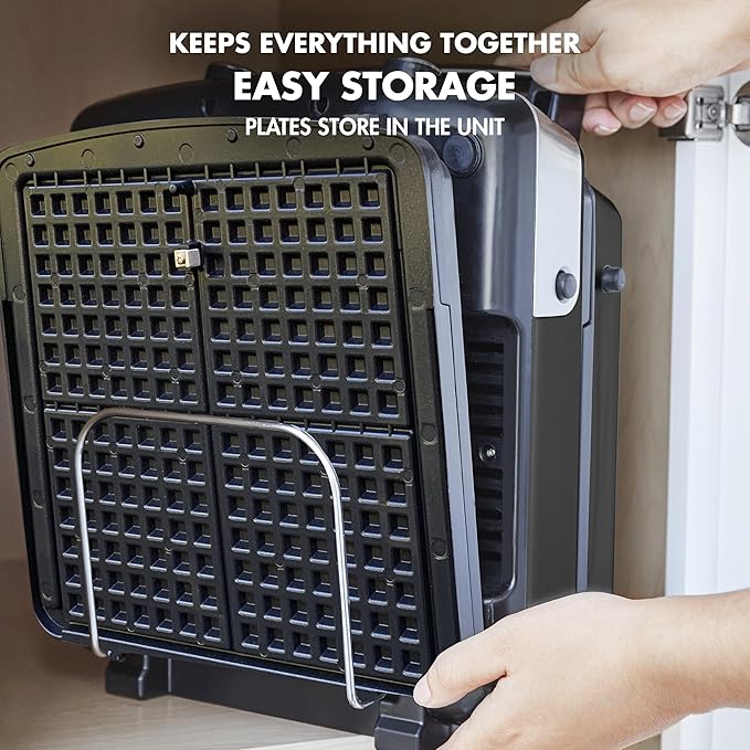 - SIMPLE STORAGE: Belgian and Classic Waffle Plates store in the bottom of the unit for easy access.