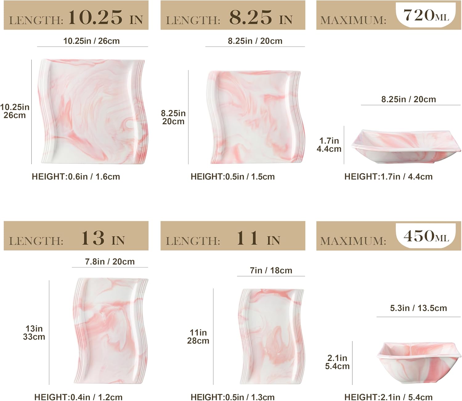 - Stylish and Low Maintenance - Featured with low-profile wavy-shaped square design, each plates and bowls sets are distinct; The pink dinnerware set is designed to provide the best dining experience while requesting low maintenance, saves you time and effort in upkeep