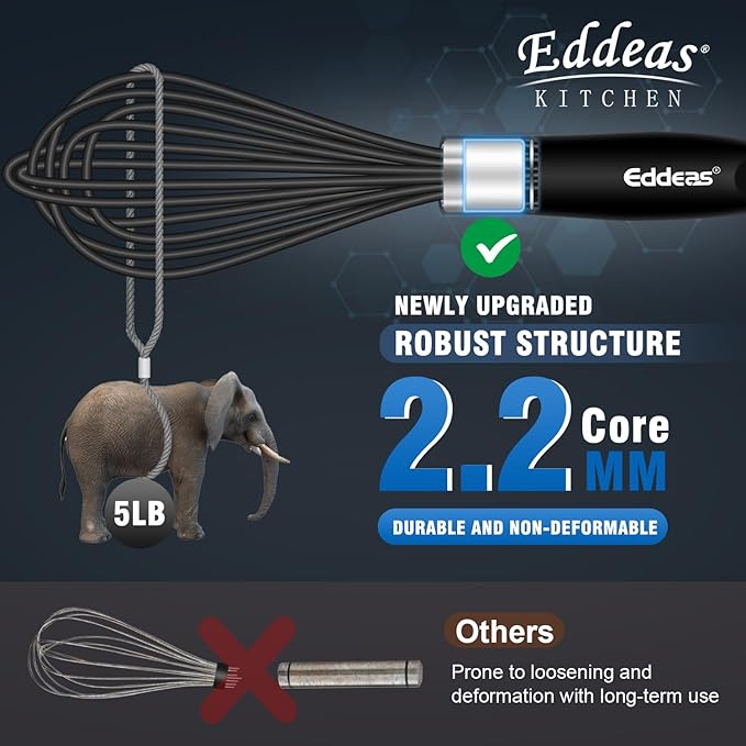 - FOOD GRADE SILICONE - Eddeas Silicone Whisk are made with food grade silicone wrapped with high quality steel wire, which solves the problem of friction between kitchenware and damage to the non-stick coating, Whisks for cooking protects your non-stick cookware, plus the built-in The steel wire, which provides strong support when stirring, wisking tools is the first choice in the kitchen.
