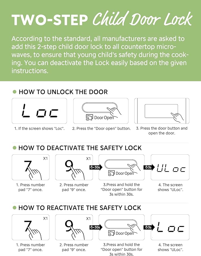 - Settings, clock, kitchen timer, child safety lock, easy auto-cook functions: Popcorn, potato, pizza, frozen vegetable, beverage, reheat