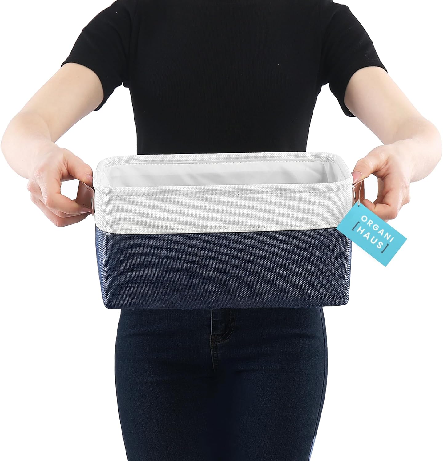 OrganiHaus Small Fabric Storage Baskets for Shelves 3 Pack, 12x8in Closet Storage Bins for Shelves, Cloth Baskets for Organizing, Linen Closet Organizers, Fabric Basket, Navy Blue/White