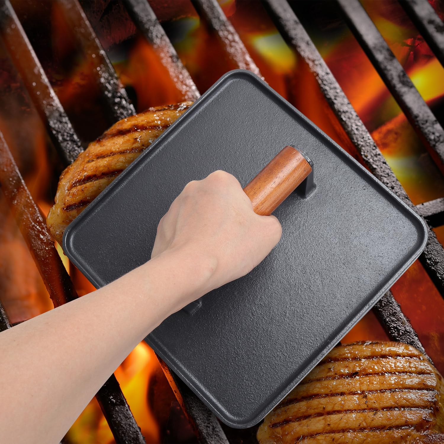 - Heavy and sturdy cast iron smash burger press: Made of thicker and heavier cast iron, our hamburger bacon press effortlessly crushes burgers, flattens bacon, and allows food to heat evenly, saving cooking time. The handle is made of heat-resistant natural solid wood for sturdiness and durability, allowing you to grill comfortably and safely.