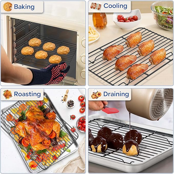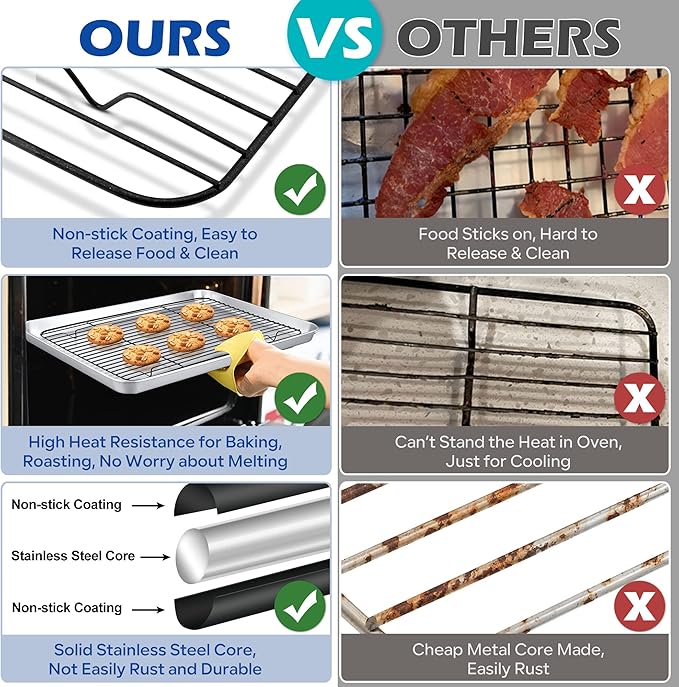 - Non-Stick & Easy Clean: The baking racks coated with nonstick coating helps quick and easy to release food without residue sticking to the baking rack, Non-stick finished makes it a breeze to clean by hands with soft cloth, But please do not use steel wool to avoid scratching the non-stick surface, Serve for lasting long life
