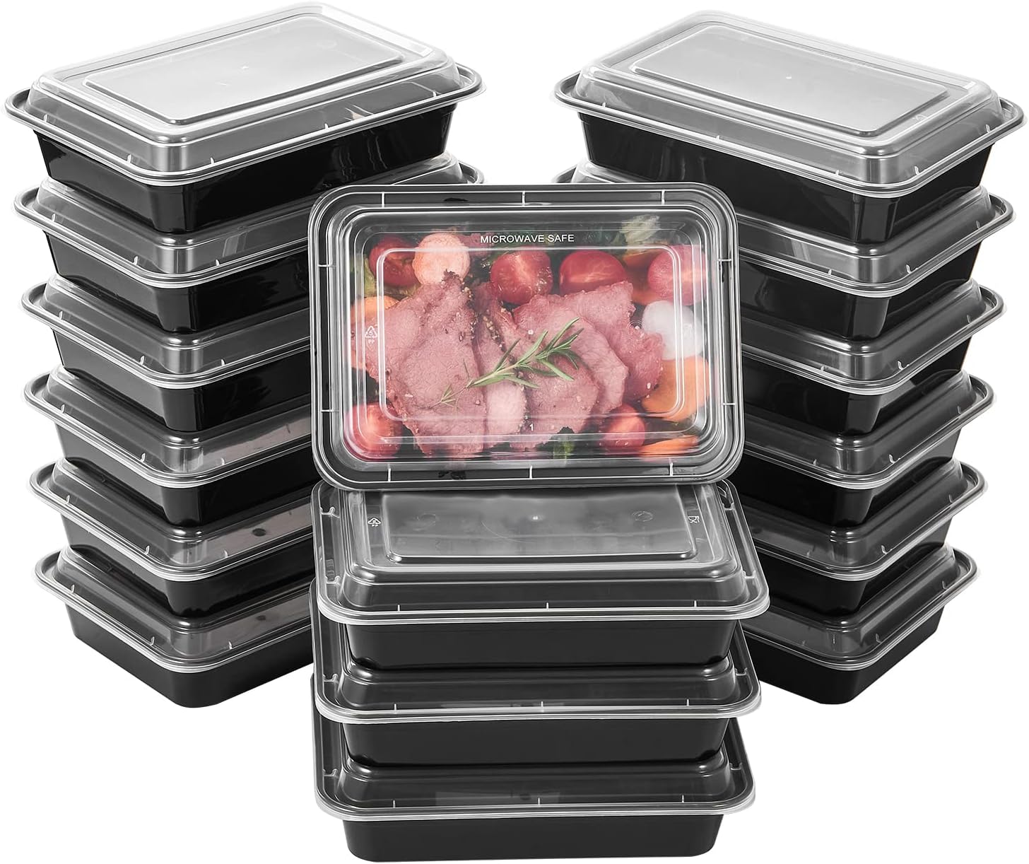 FULING 50 Pack Meal Prep Plastic Food Storage Containers With Lids 28 oz 1 Compartment Black Rectangular Reusable To Go Lunch Prepping Boxes BPA-Free Microwavable Freezer Dishwasher Safe Stackable