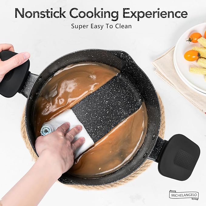 - COMFORTABLE HANDLES - This non stick pot comes with ergonomically designed handles that are wrapped in soft silicone that stays cool to the touch and easy to hold.