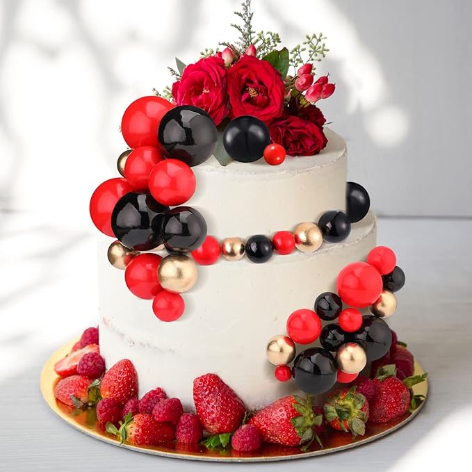 108 Pcs Balls Cake Topper DIY Cupcake Insert Foam Balloons for Cake Baking Wedding Anniversary Birthday Decoration(Red, Black, Gold,Multi Sizes)