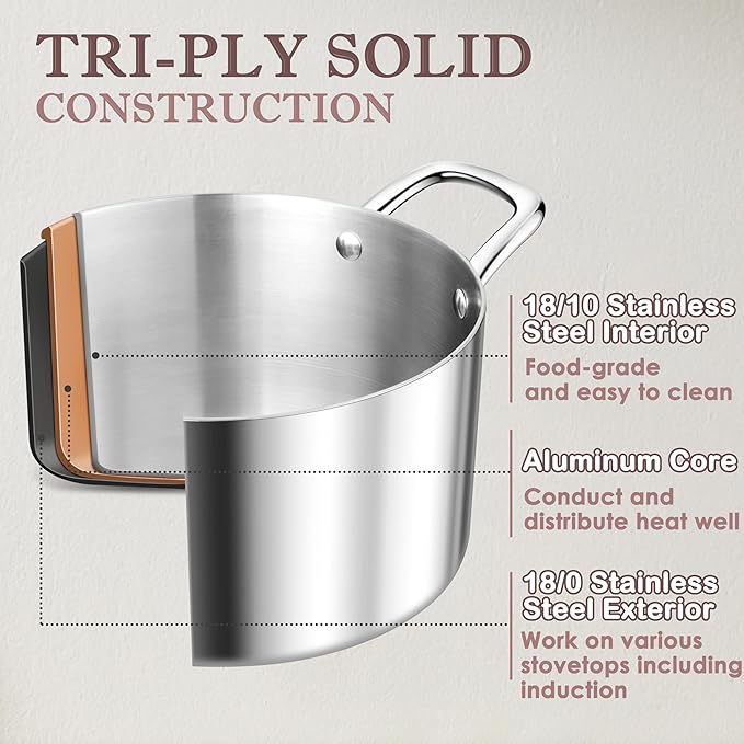 - Functional cooking pot, the stock pot comes with tri-ply solid construction, sturdy and resist warping, excellent heat conductivity and distribution, cook food quickly and evenly, great for cooking soup, pasta, meat, vegetable