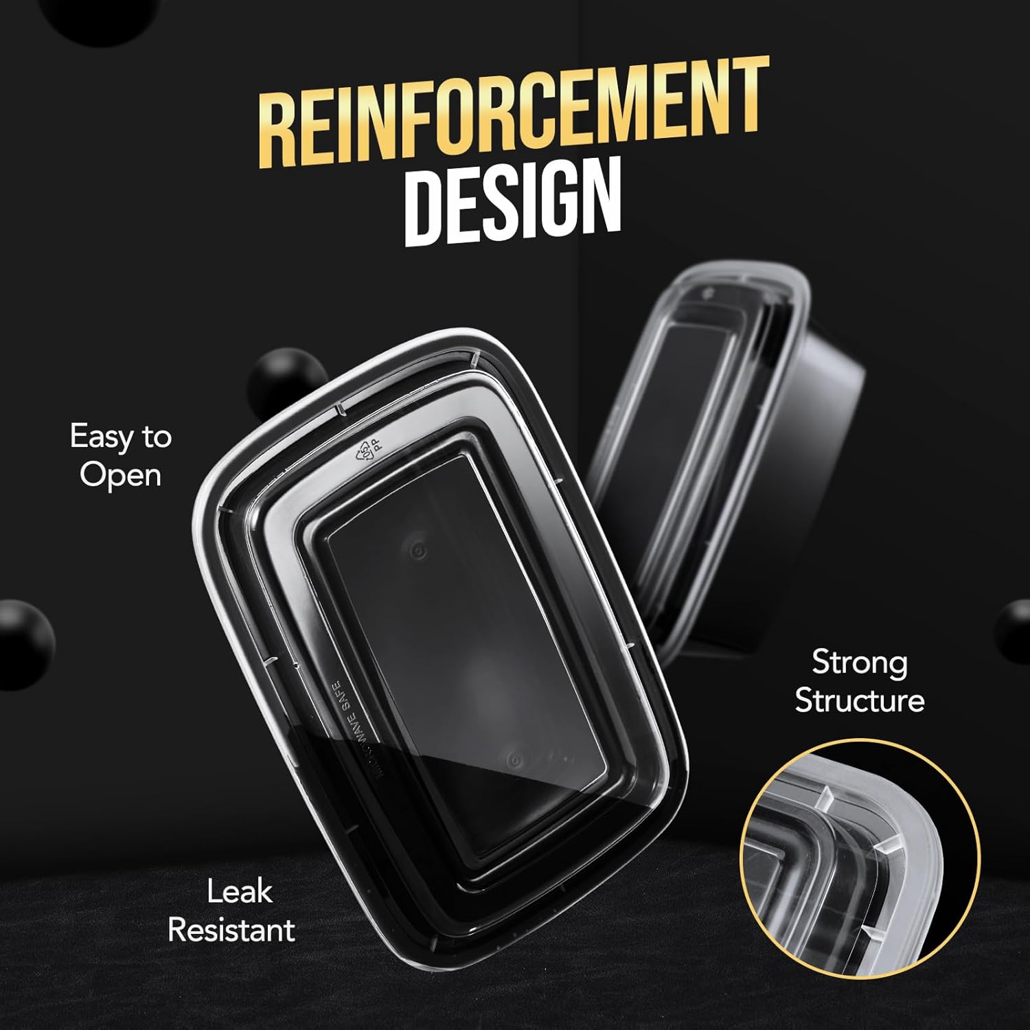 100-Piece (50-Pack) 34 OZ Meal Prep Containers Reusable with Lids, Sturdy Leakproof & Food Safe, Microwave, Freezer, Dishwasher Safe To Go Food Containers, Plastic Take Out Containers, Black