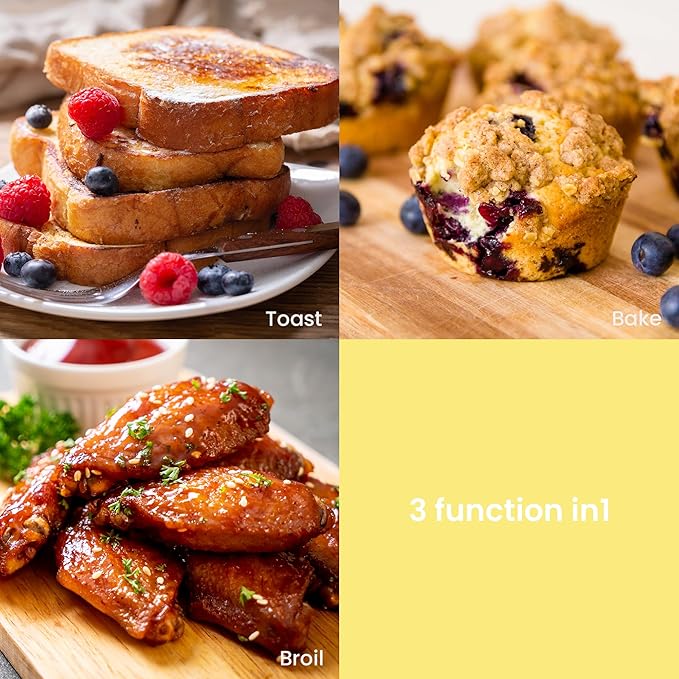 - 【3 IN ONE VERSATILE COOKING FUCTIONS】Bake, Broil and a Toast all in a mini compact toaster oven to fit your daily cooking needs.