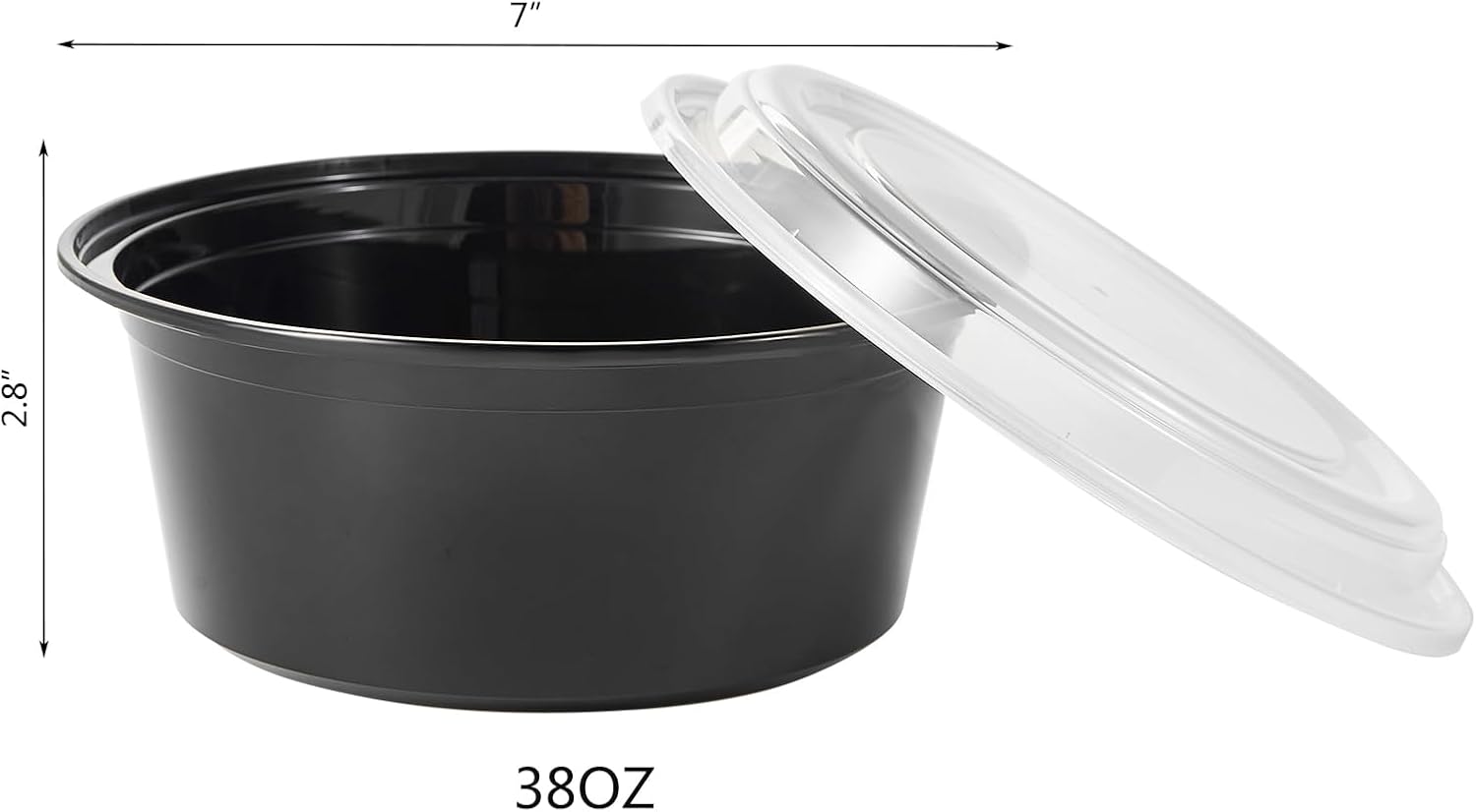 FULING 38 oz 50 ct Round Meal Prep Containers with Lids Plastic Food Storage To Go Lunch Plan Box Disposable Take Out Bowls Black BPA Free Reusable Durable Stackable Microwave Freezer Dishwasher Safe