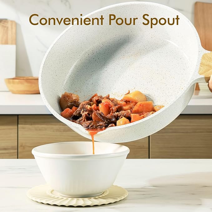 - PERFECT CHOICE FOR A SMALL FAMILY - This beige white nonstick ceramic cooking set includes everything your kitchen needs: a 9.5" frypan, an 11" / 4.3qt sauté pan with lid, a 2.6qt saucepan with lid, a 4.7qt casserole with lid, 2 silicone utensils, and 4 reusable pot protectors.
