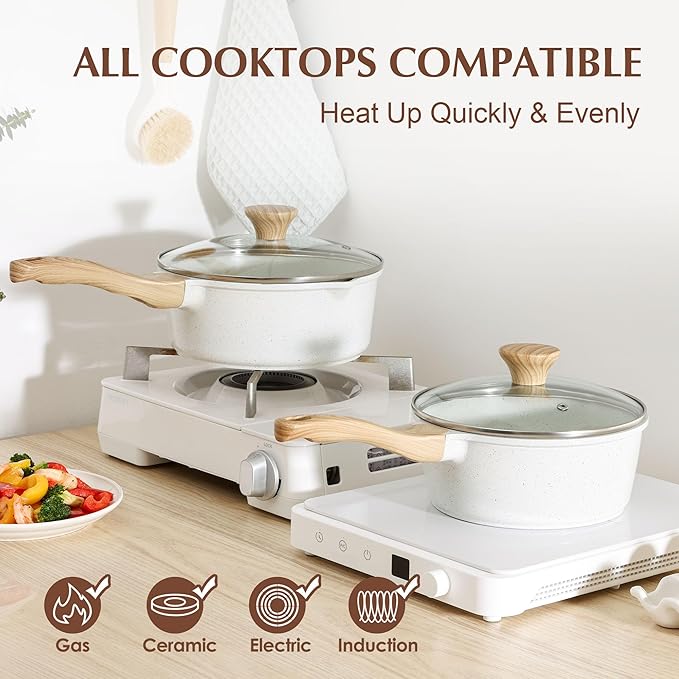 - Suitable For All Stoves - High magnetic conductive stainless steel base allows the 2 qt saucepan with lid nonstick to work on all cooktops, including induction. The core of small sauce pan stone is made of cast aluminum, which is sturdy, long-lasting and heats up quickly and evenly.