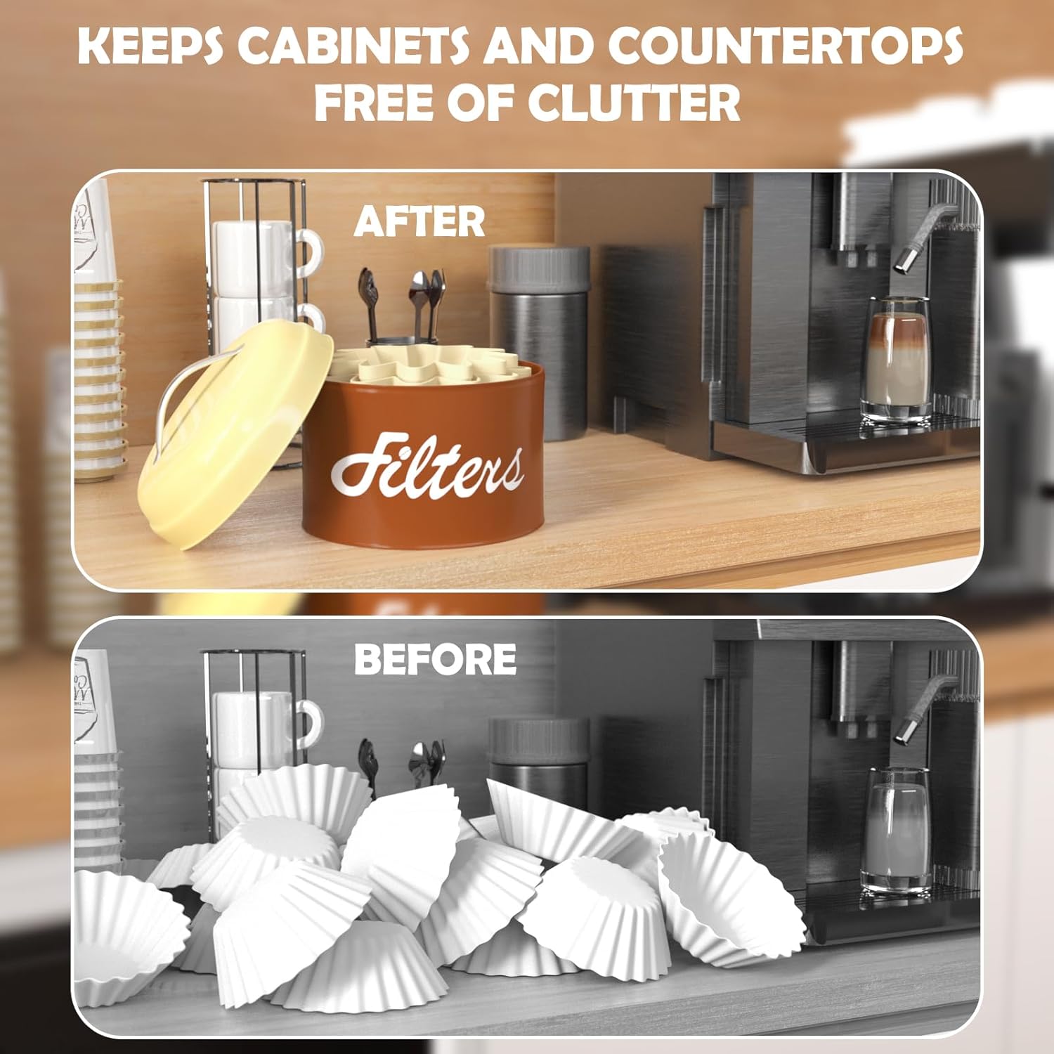 - 【BASKET COFFEE FILTER CONTAINER】 Our coffee filter holder with lid is capable of holding various sizes of round basket-shaped pleated filters commonly found in the market, a sizeable internal capacity is enough to store your daily coffee filters, it is a perfect addition to your coffee bar decor
