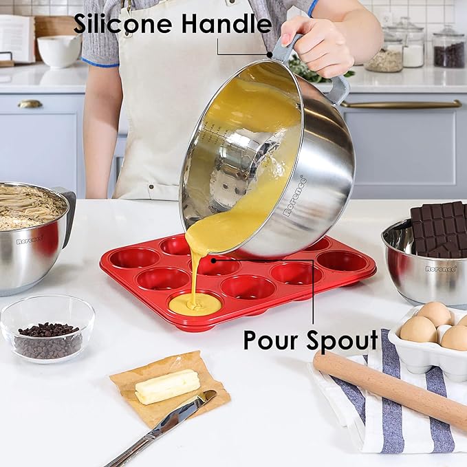 - EASY TO USE: The silicone handles make the bowls easier to lift and hold down on a surface. The pour spout allows for easier pouring. The non-slip silicone bottom ensures the bowls will stay in place when you mixing