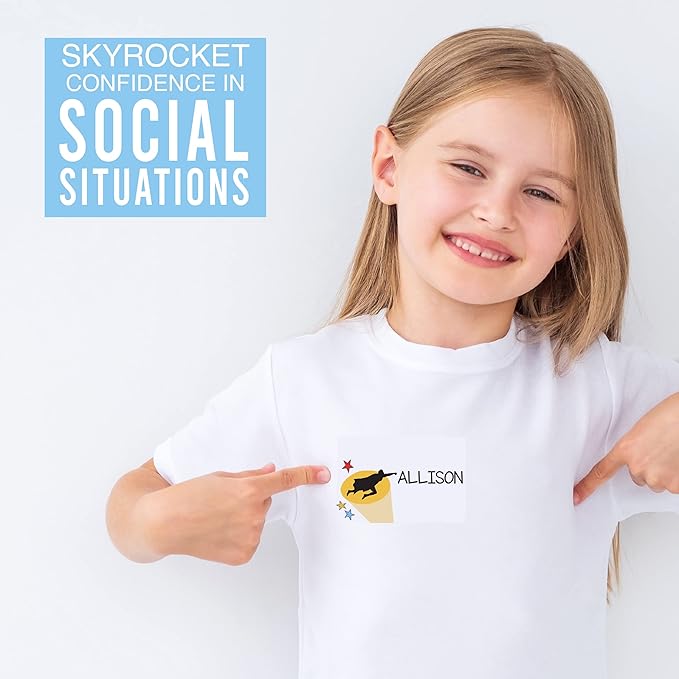 - Skyrocket Confidence In Social Situations; These blank name tags stickers make it fun and easy to strike up conversations; Make a memorable first impression with these large name tags for clothing, name tag stickers for clothes, name tag stickers for adults