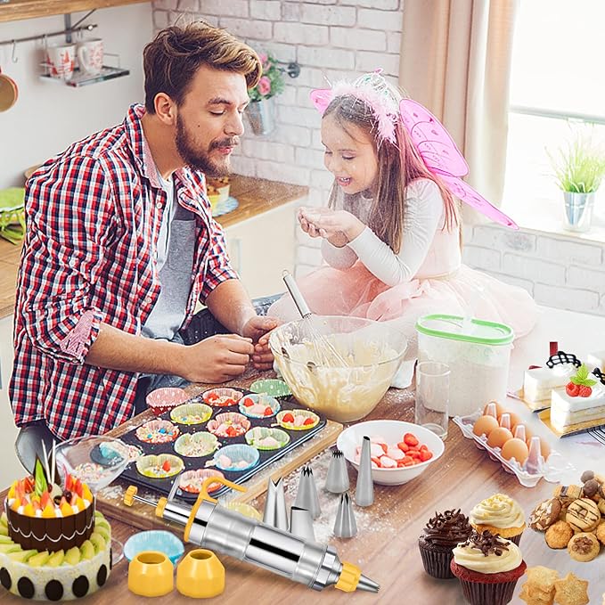 - 【Practical & Easy to Use】This icing dispenser is made of a combination of stainless steel and plastic, so you can disassemble all the parts for easy cleaning(the cake decorating injector kit comes with a cleaning brush) and use. Our cake decorating icing tool set can as a gift for baking lovers on birthdays, Christmas, Mother's Day, Easter, housewarmings, or other occasions; You will find that the most incredible buttercream flowers are so easy to make with this pastry decorating kit