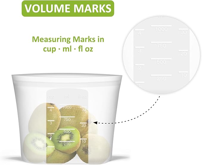 - 【THOUGHTFUL & ECONOMICAL】Small size: 33.8fl.oz/1000ml. This silicone ziplock bag features clearly marked measurements in cups, milliliters, and fluid ounces for easy use. The translucent body helps to get a glimpse of what's inside, though not in crystal clear detail. Its robust construction ensures improved strength and durability. Plus, One silicone bag can reduce up to 300+ single-use plastic bags a year, helping to create a waste-free world and save you a lot of money.