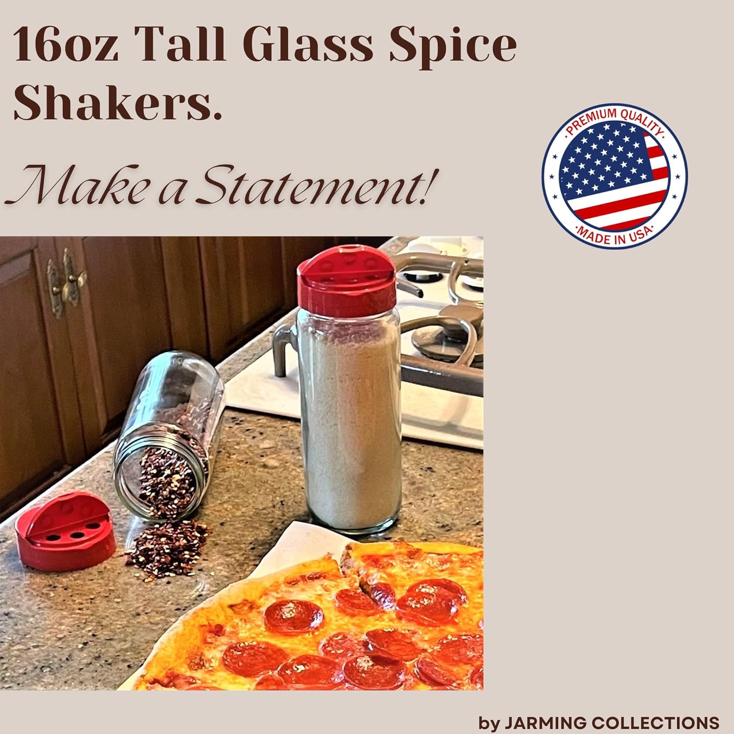 - HEAVY-DUTY STORAGE CONTAINERS: These spice bottles are USA-made using reusable BPA-free materials. Each features an airtight clear glass that can be readily personalized with any decorative label, choices include Black or Red plastic shaker cover with enlarged holes on one side and a sifter on the other for a larger, more measured portion .