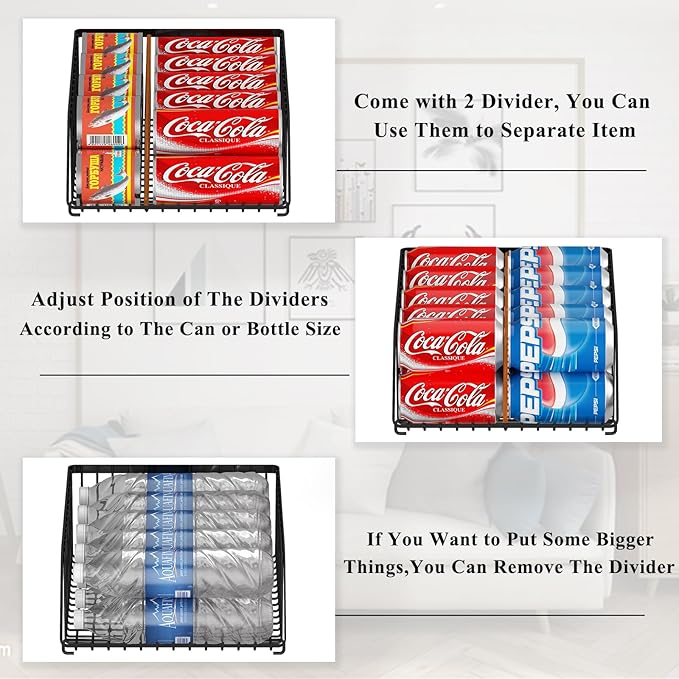 - More Than A Soda Can Organizer: GILLAS stackable beverage soda can organizer rack is versatile, according to the can or bottle size through the removable divider. Come with 2 divider, you can use them to separate item. If you want to put some bigger drink, you can remove the divider