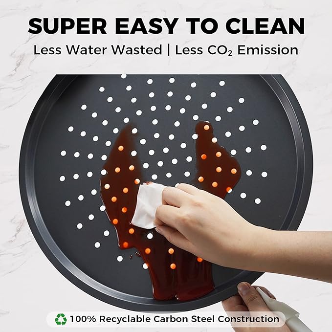 - EASY TO CLEAN - It only takes two minutes to clean the round pizza pan thoroughly, as there are hardly any impurities stuck to the quality non-stick coating of the pizza tray for the oven after baking.
