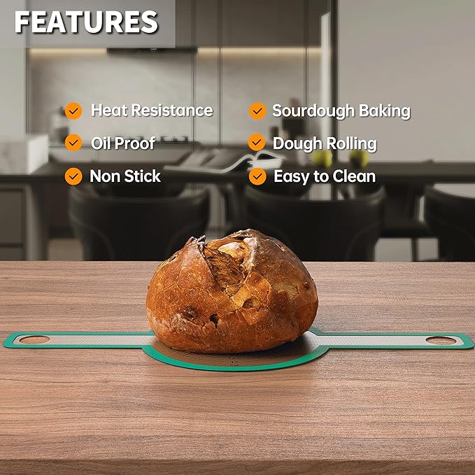 - HEAT RESISTANT & LONG-LASTING – Safe to use up to 480°F. The smooth surface ensures a uniform heat distribution with no burnt or soggy bread bottoms. Our mats are, just like most high-quality baking mats, made of silicone and fiberglass. Bread Basics mats have a very strong and flexible fiberglass core, fully surrounded by double-sided silicone covering. This ensures the mats can withstand extreme temperatures, are pliable and strong, reject stickiness & can be reused many times with no damage.