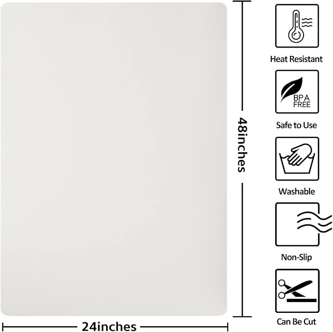 - Extra large silicone mat: Size of 48” x 24”, almost can fit most kitchen countertops, dining tables and other workbench. It can be placed under the air fryer, microwave, toaster oven, induction stove, coffee maker to protect the kitchen countertops and other surfaces against spills, scratches, grease, heat, etc. It’s cuttable to fit different sizes and shapes.
