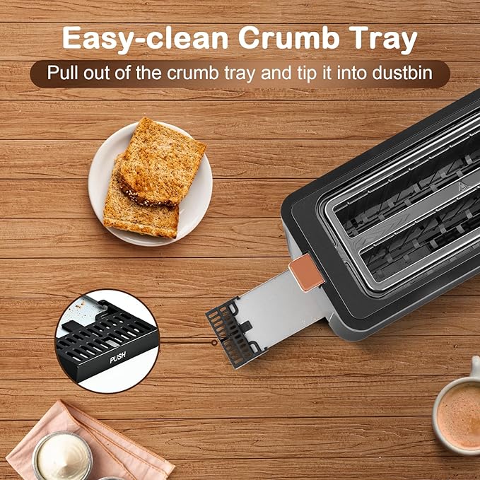 - 【Easy To Clean】: Made of non-stick food grade stainless steel in toasting slots, and a removal crumb tray on the bottom, you can always clean the bread toaster with less effort. Stainless steel and heat resistant material lead to a cool touch body and easy cleaning appliance in your kitchen (The slots is hot during toasting, do not touch directly)
