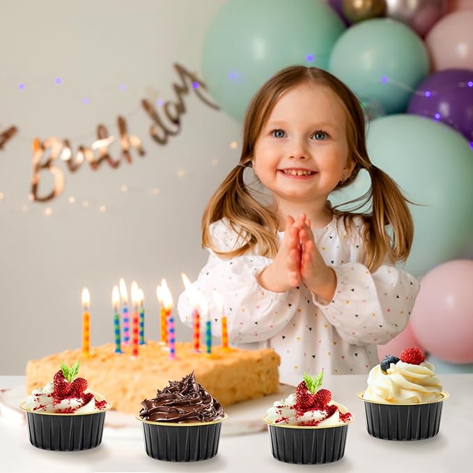 LNYZQUS 5oz Mini Cake Baking Pans with Lids 100 Pack, Disposable Mini Aluminum Cupcake Pan Muffin Cups, Small Cake Baking Cups Muffin Tin Cupcake Liners Containers for Custard Creme Brulee-Black