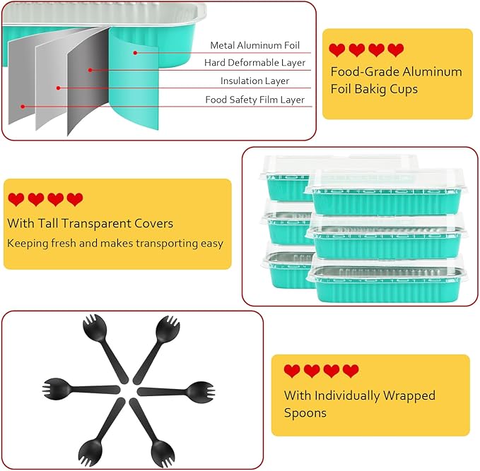 - 【Pack of 100 Sets】 - Including 100pcs mini cake pans with 100 clear lids,and 100 individually wrapped spoons.The mini loaf pan size:6.5”x2.5”x1.2”,the dome lids 0.8” high.Abundant small cake pans with lids are great for bake shops,big parties.