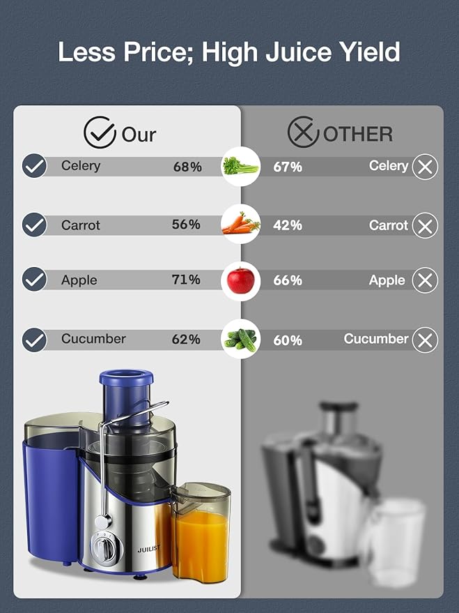 - Are you looking for a juicer with a juice yield that takes up little counter space - The compact design takes up little room on your countertop. After repeated tests in the laboratory, the juice yield of our juicer extracts up to 26% more juice than other 800w juicers