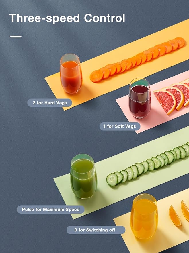 - 3-Speed Functions - "1" is a low speed, for soft fruits vegetables like oranges, watermelon, tomato, etc; "2" is a high speed, for hard food like apple, carrot, celery, etc. “P” is the highest speed(Reach maximum speed after release). Customize your favorite juices, it makes the kitchen more colorful, you could juice a bunch of fresh juice and drink them to replenish energy and nutrition when needed