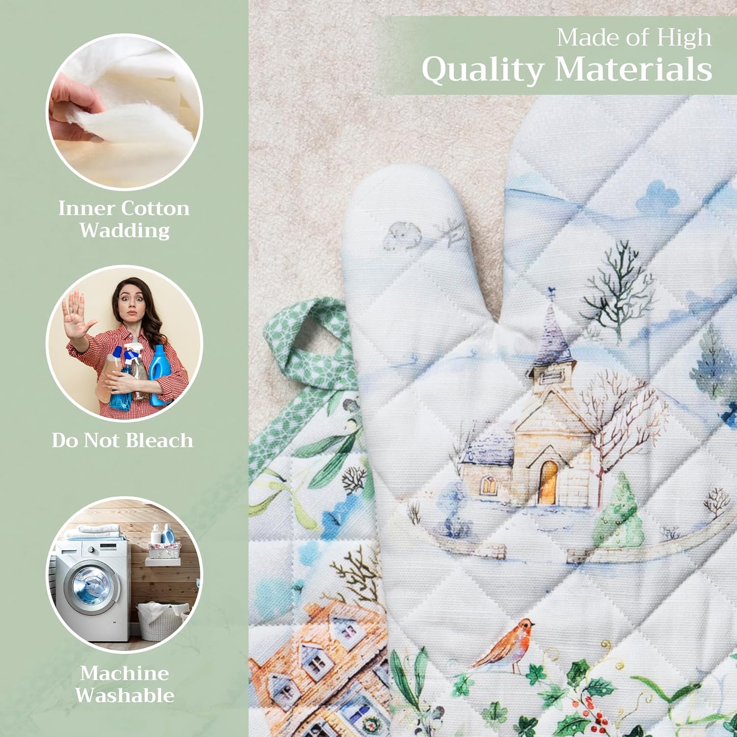 Maison d' Hermine 100% Cotton Oven Mitt & Pot Holder Set (7.5"x13" & 8"x8") Heat Resistant BBQ Cooking Gloves with Loop, Baking, Grilling, Kitchen, Handling Hot Pans (Snowy World)