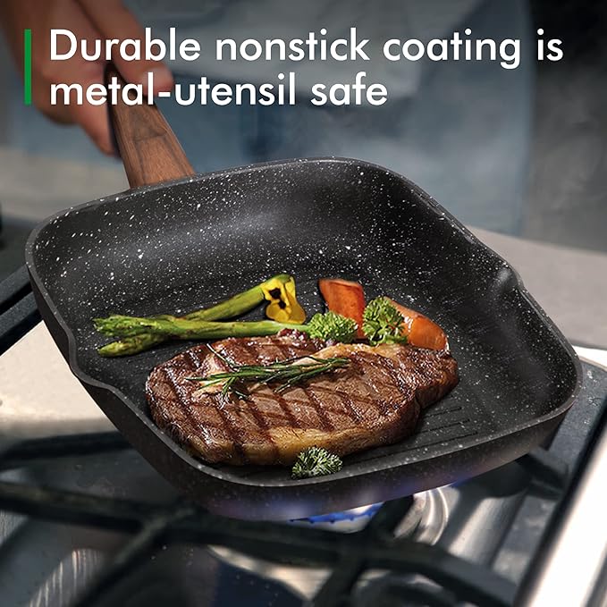 - Nonstick Granite Stone Coating: The pots and pans set features a durable granite stone coating that ensures easy food release and quick cleanup. The coating is also scratch-resistant and safe for use with metal utensils