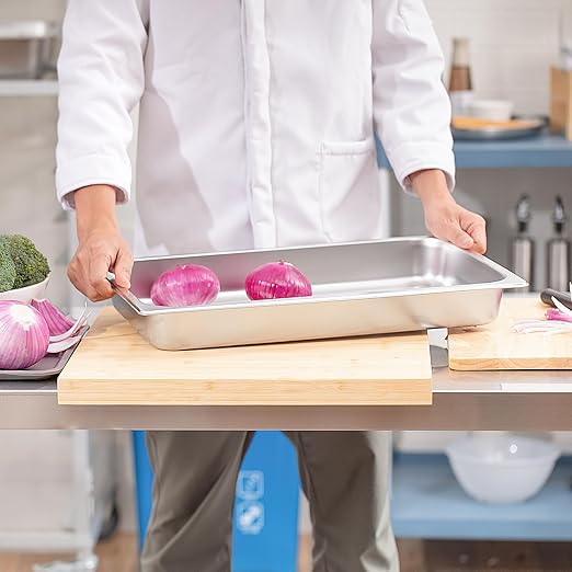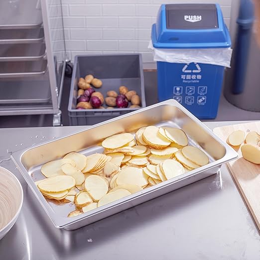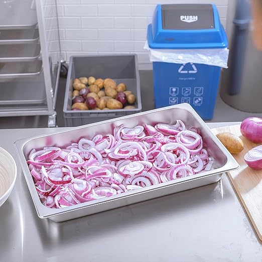 - User Friendly: The catering food pans feature reinforced edges and round corners for added strength and protection where the pan undergoes the most wear and tear, ensuring long-term use. The pans have an integrated design with no welding or gaps, and crimping round edges protect your hands from scratches while ensuring a secure and comfortable grip that is deformation-resistant.