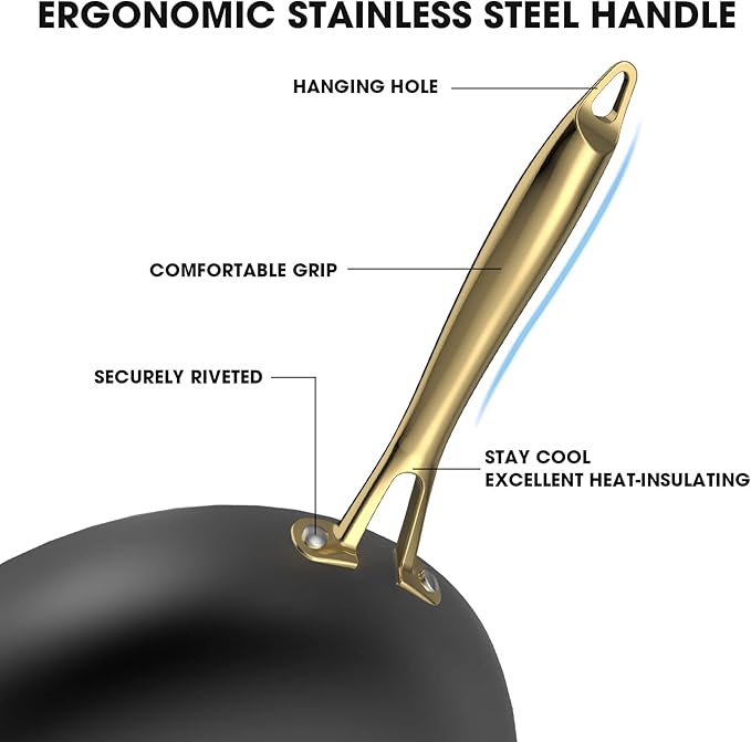 - DOUBLE-RIVETED ERGONOMIC HANDLE: The stainless steel handle with double-riveted is comfortable to grip, stylish, durable, secure and stable. Stays cool on the stovetop so no need to worry about burns, you can cook with ease with this frying pans nonstick. The hanging hole design made the skillet convenient to hang up and save space