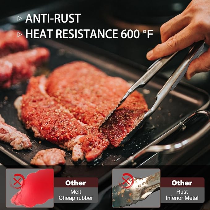 - FOOD LEVEL STAINLESS STEEL: kitchen tongs The heavy duty EDDEAS kitchen tongs built with stainless steel, sturdy, heat resistance, anti-rust, anti-corrosion, light weight, easy to handle like new forever. This tongs for cooking comes with a set of 3, standard7"Serving Food Tongs 9" cooking tongs and large sized 12" BBQ grill tongs.