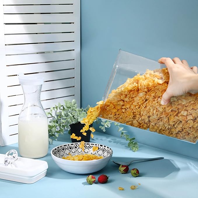 - 4 PK RECTANGULAR CONTAINER SET – BREAKFAST CEREAL SET: Set includes 1 x Rectangular–Tall (4.4qt), 1 x Rectangular-L (2.8qt), 2 x Regular-S (0.5qt) designed for optimal storage of cereal, granola, grains, oatmeal, dry fruit, chocolate chips, pasta, and nuts. Versatile enough for bathroom essentials like Q-tips and makeup, office supplies, and general home organization. A must-have for keeping your pantry and space neatly arranged!
