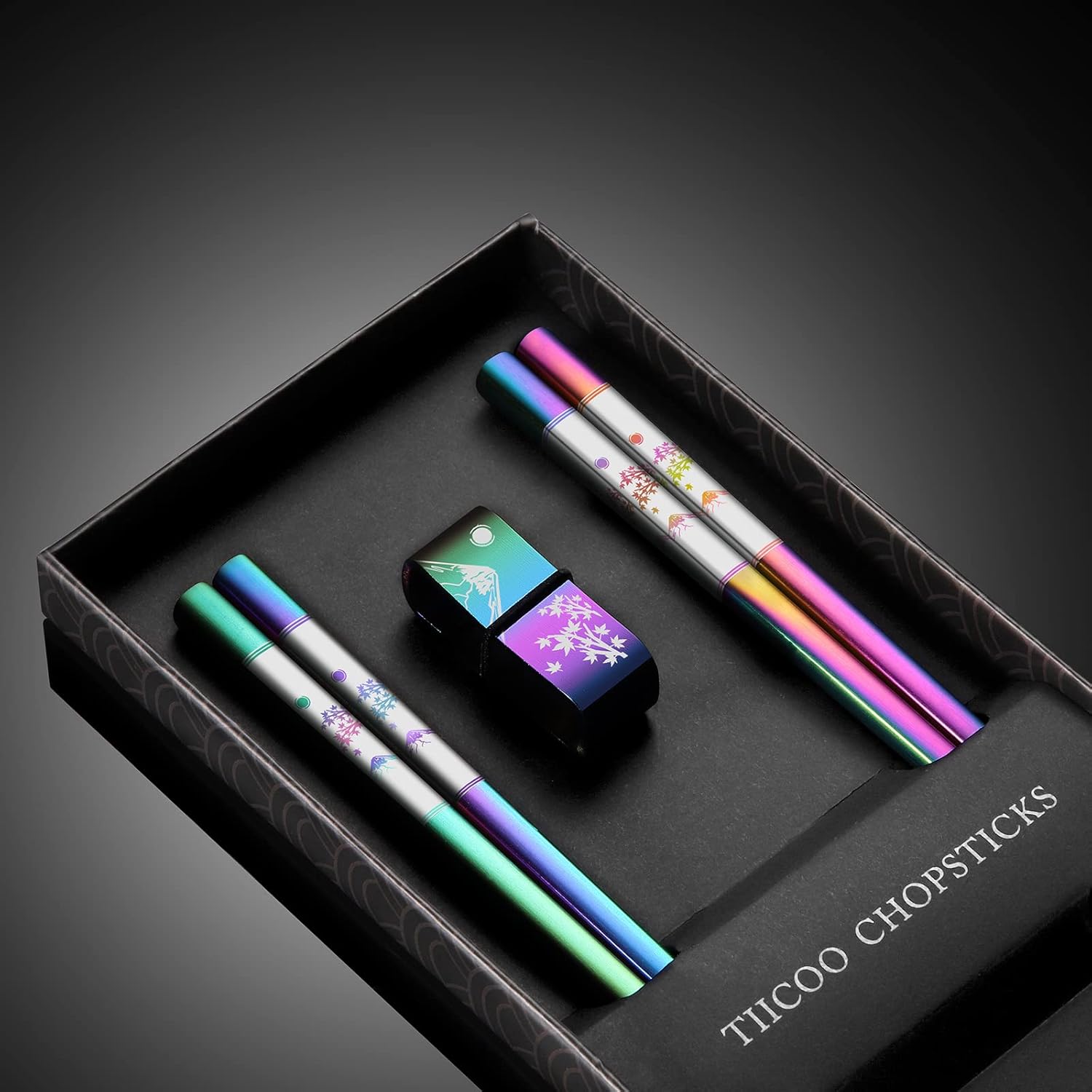 Metal Chopsticks Reusable 2 Pairs Titanium Plated 18/8 Stainless Steel Chopsticks with Holder, Dishwasher Safe Non-Slip Japanese Style Laser Engraved Chop Sticks Gift Set (Rainbow)